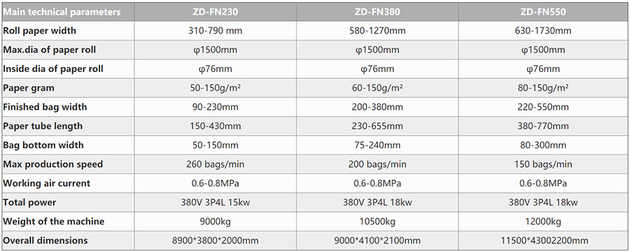 The machine is used to produce environmental protection paper bags, food paper bags, shopping paper bags and various kinds of portable paper bags with paper as raw materials. The machine completes the bag making of primary color paper or printed web paper at one time through the machine, and the paper is coated with edge glue, formed into a cylinder, cut off, indented, glued at the bottom, formed at the bottom of the bag and transported out of the bag. The whole process is completed simultaneously at one time. Truly fully automated production, can effectively save labor costs.
