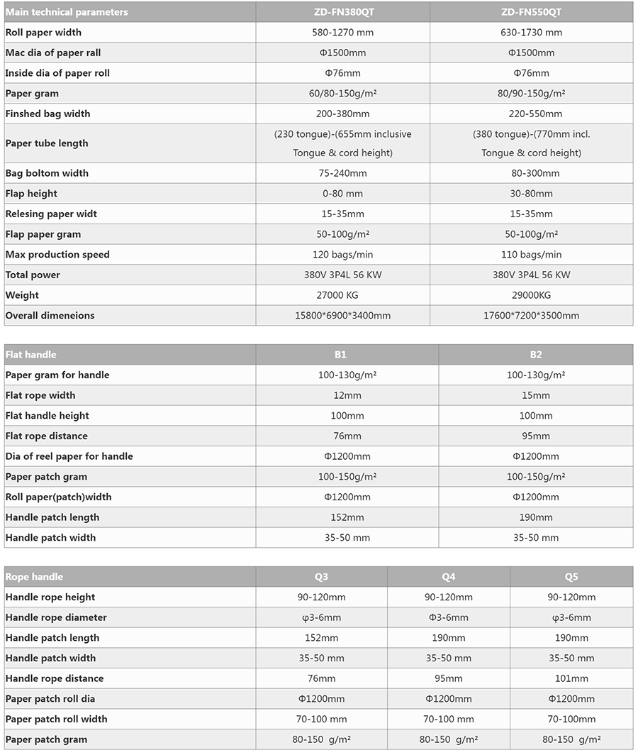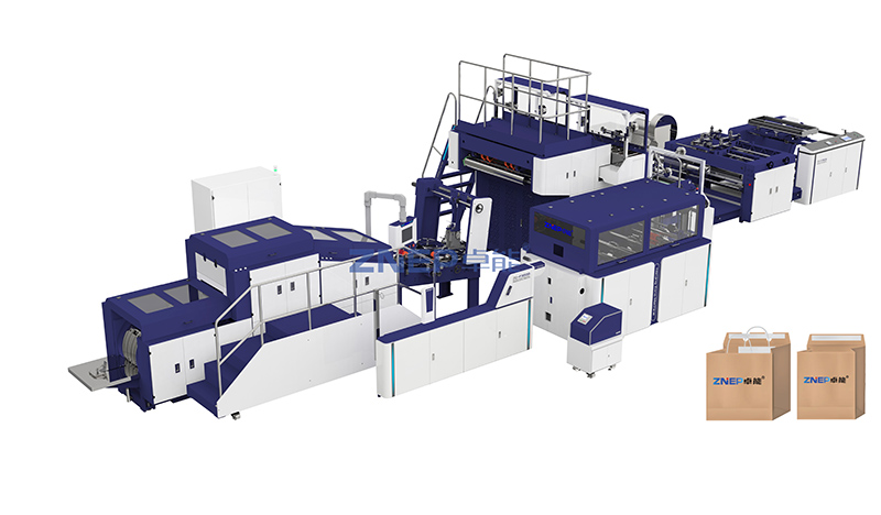 The machine is used to produce portable paper bags with hand-held and tongue-in-mouth. The hand-in-hand station automatically makes the prepared round rope and roll paper into hand-in-hand, and transmits the prepared hand-in-hand to the stations of cutting handle, sending handle, pasting handle and pressing handle through the conveying system, then, the primary color or printed web paper will be used for opening the window of the tongue and absorbing waste, gluing sticker, pre-pricking of the easy-to-tear line, pre-pricking of the tongue position, breaking of the patch avoiding rope position, gluing of the patch position, automatic pasting of the hand-held paper, and then the host will be used for edge gluing, cylinder forming, breaking, cutting, creasing, bottom gluing, bag bottom forming and conveying, the whole process is completed synchronously at one time. Truly fully automated production, can effectively save labor costs.