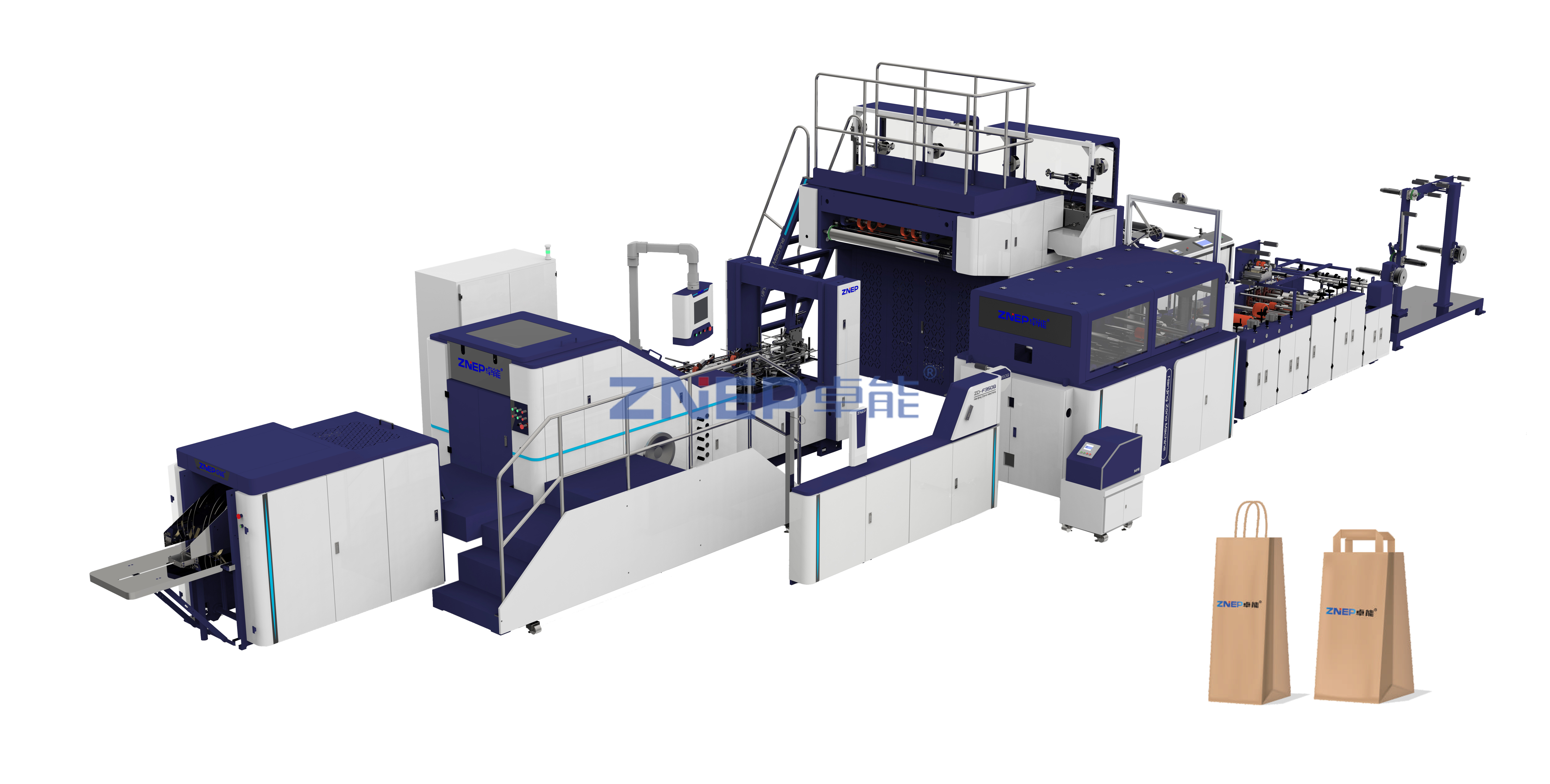 该机器用于生产带手挽的手提纸袋,由手挽工位将原材料自动做成手挽,通过输送系统将做好的手挽传送给切把、送把、贴把、压把的工位,然后将原色或印刷好的卷筒纸进行贴片位点断、贴片位涂胶、自动粘贴手挽,再由主机将贴有手挽的纸张进行涂边胶、成筒、切断、压痕、底部涂胶、袋底成形并输送出袋,整个过程一次性同步完成。真正实现了全自动化生产,能够有效地节省人工成本。