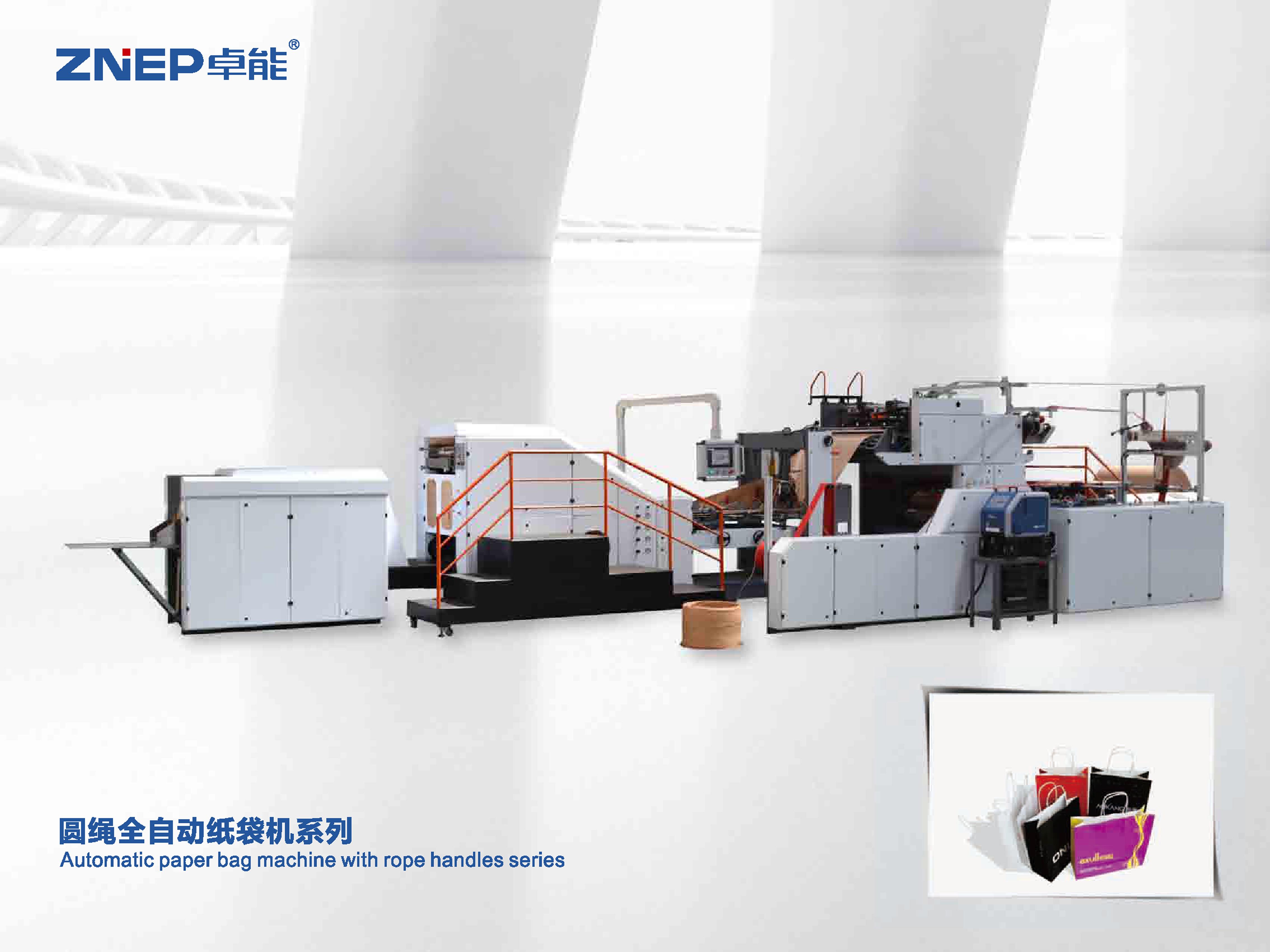 圆绳全自动纸袋机,用于生产带手挽的手提纸袋,由手挽机将卷绳和贴片卷筒纸制成手挽,通过输送系统将手挽送至贴把机组然后将原色或印刷好的卷筒 纸进行贴片位点断、贴片位涂胶、自动粘贴手挽,再由主机将贴有手挽的纸张进行涂边胶、成筒、切断、压痕、底部涂胶、袋底成形并输送出袋,整个过程一 次性同步完成。整机采用日本原装进口电控系统,生产的纸袋长及成品的收料,精确度高,稳定性强,维护简便,生产高效,是各大印刷厂及生产纸袋厂家为理想的选购设备。